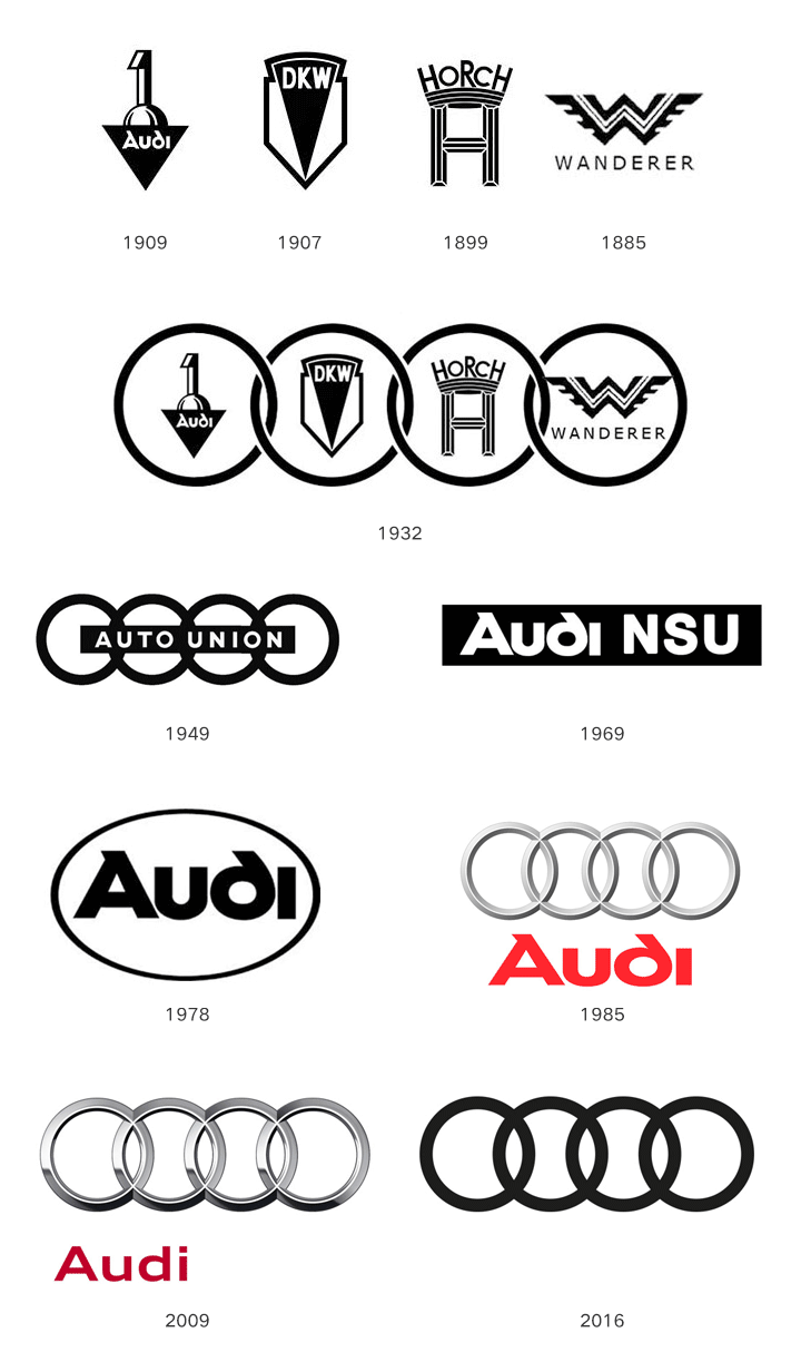 奥迪的四环LOGO我们都非常熟悉了,四个圆圈,每个圈代表最初的一家联盟公司。